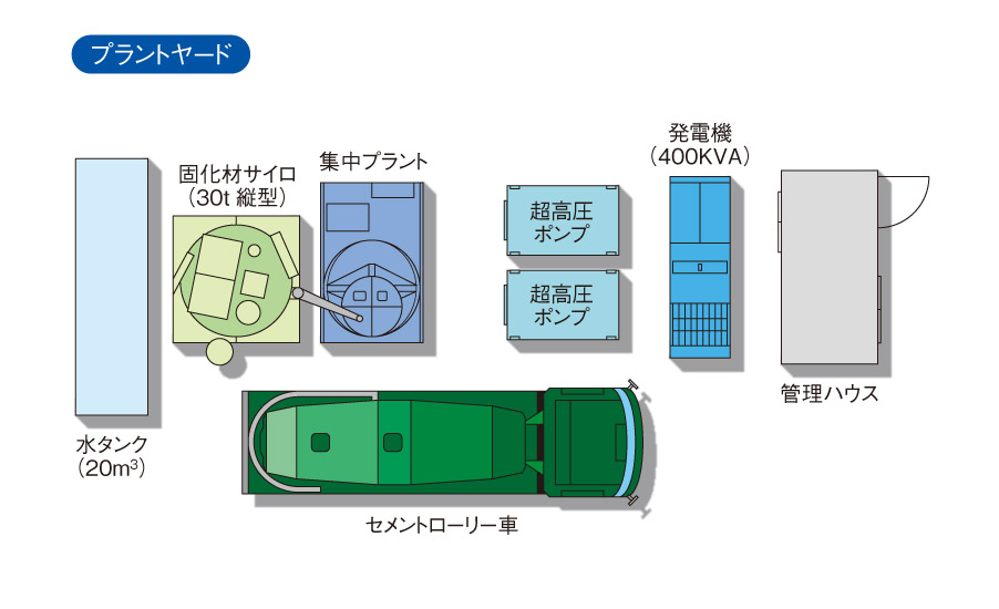 - ■ 通常の高圧噴射工法の配合で見られるような混和剤を必要としない、優れた圧送性と分散性を併せ持つ材料です。