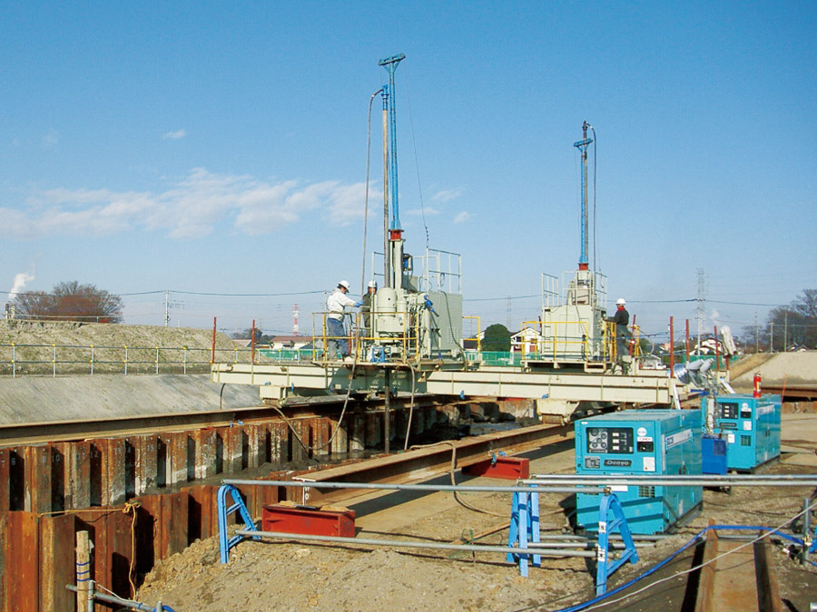 - ■ H鋼や台船に横行式移動架台を組合せた簡便で効率的な仮設での施工のため仮設費用の低減が計れます。