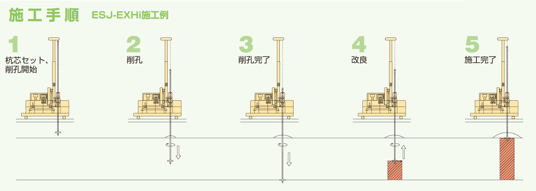 ESJ-EXHi、ESJ-EXL工法は、ボーリングマシンを使って、ロッド先端に装着した攪拌翼付特殊モニターから水平方向に固化材スラリーを超高圧(40Mpa)、大容量吐出(150L/分)で噴射しながら回転引き上げを行い、中心の攪拌翼部の機械攪拌と外周部の高圧噴射攪拌を組み合わせることにより、地盤中に円柱状の改良体(コラム)を造成する工法です。