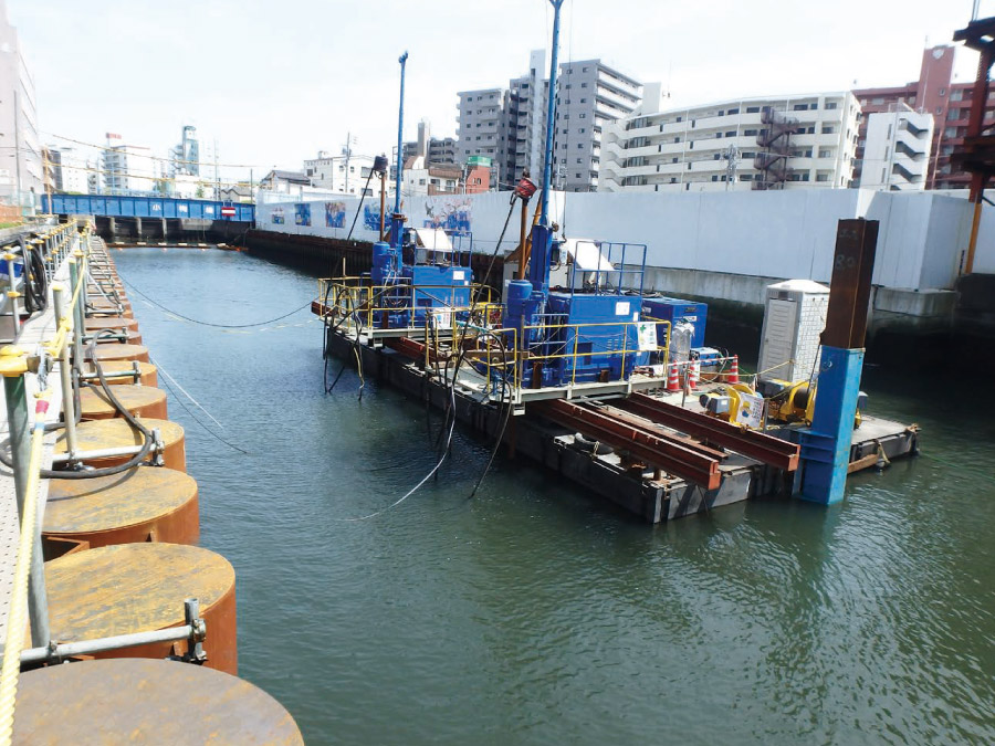 - ■ H鋼や台船に横行式移動架台を組み合わせた簡便で効率的な仮設での施工のため、仮設費用の低減が計れます。