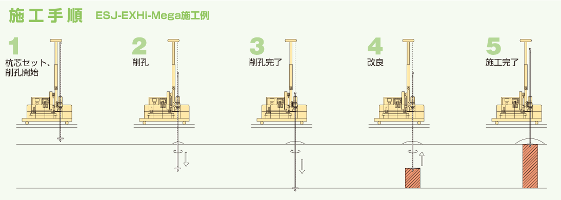 本工法は、従来型のESJ-EXS、ESJ-EXHi工法の吐出流量を大容量化することで、切削能力を高め、同じ時間でより大口径の改良体を造成できるところに最大の特長があります。