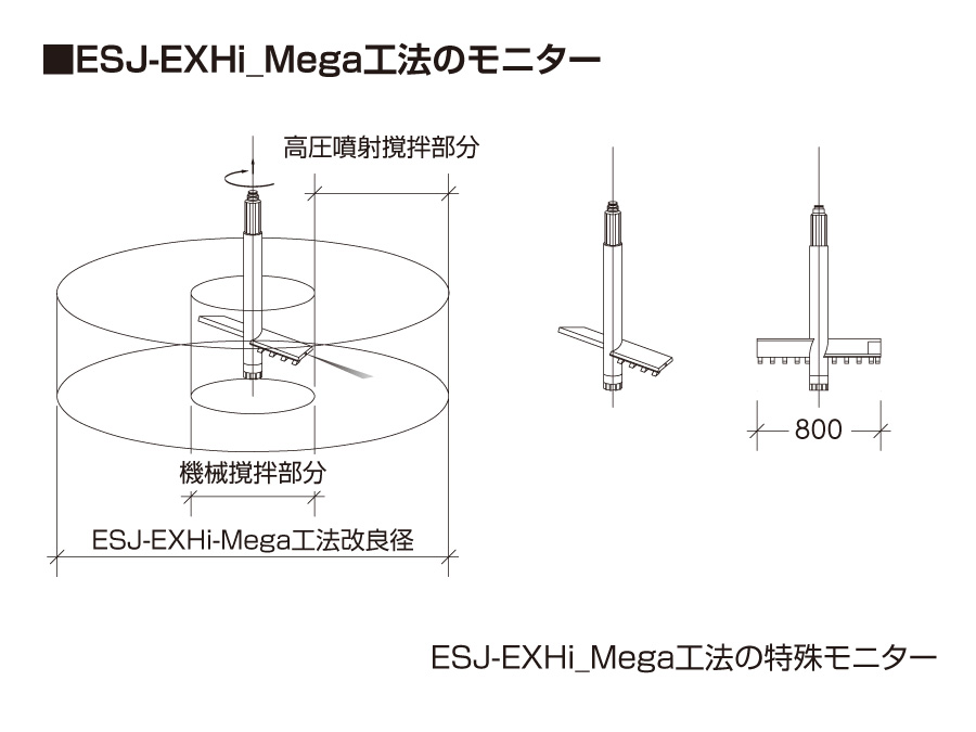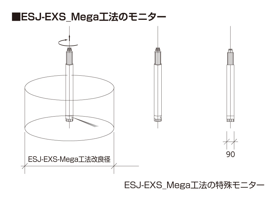 ESJ-EXS-Mega、ESJ-EXHi-Mega工法は、ボーリングマシンを使って、ロッド先端に装着した特殊モニターから水平方向に固化材スラリーを超高圧(40MPa)、吐出流量(220L/分)で噴射しながら回転引き上げを行い、地盤中に円柱状の改良体(コラム)を造成する工法です。