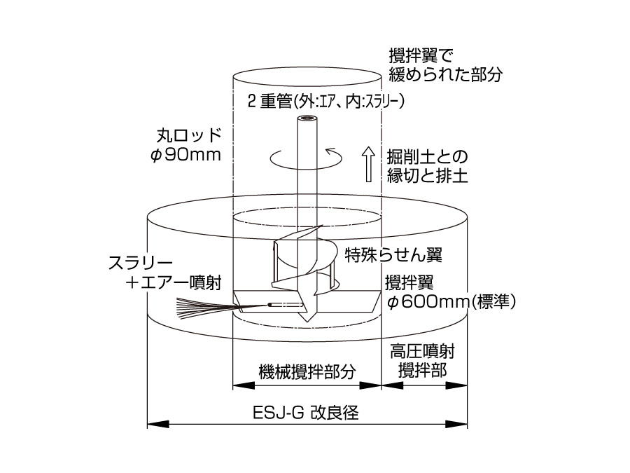 そこで、ESJ-G工法(変位低減型2重管ESJ工法)は、この問題を解決するためエアリフト効果と特殊螺旋翼との相乗効果で地盤へのスラリー注入に伴う体積増加を最小限に抑え変位を低減することを可能としました。更に、エアー噴射効果で、より経済的に大口径化を実現した地盤改良工法です。
