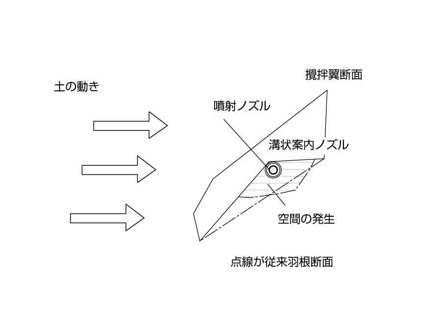 - ■ 攪拌翼に案内ノズル(溝)を設けて、空洞を発生させることで噴射ノズル先端位置でのジェット流の地山による減衰を抑えることができます。