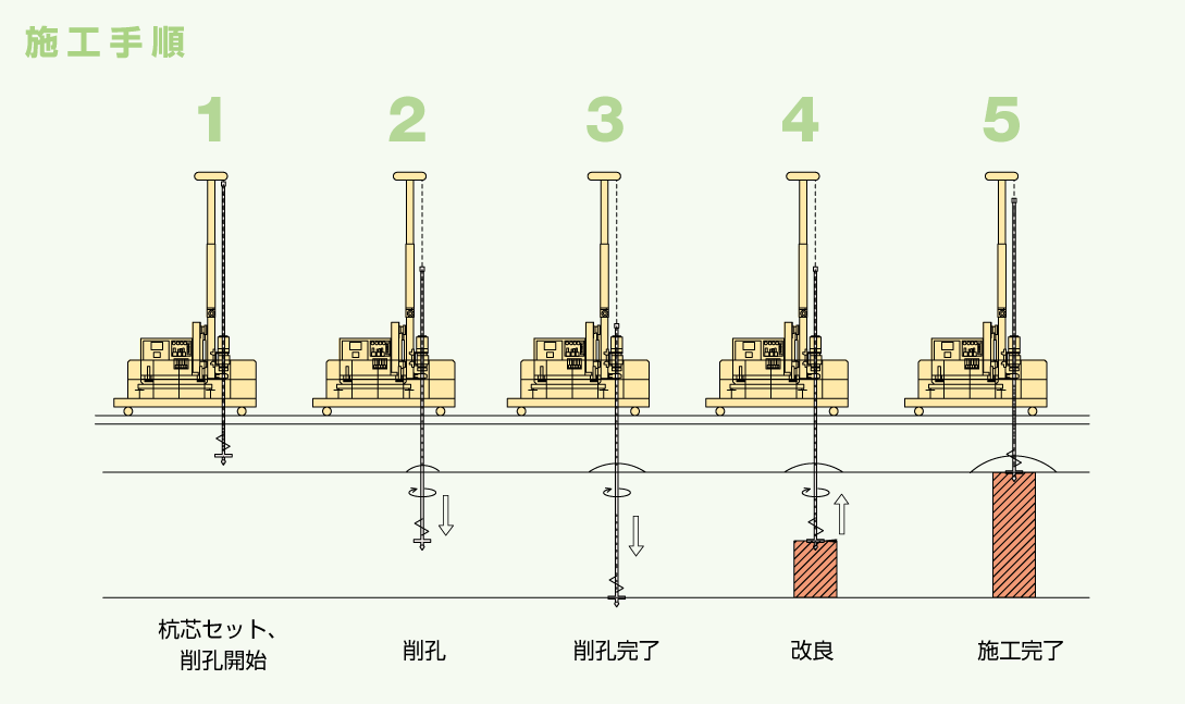 エアー噴射により、大口径・低変位を図った地盤改良工法。