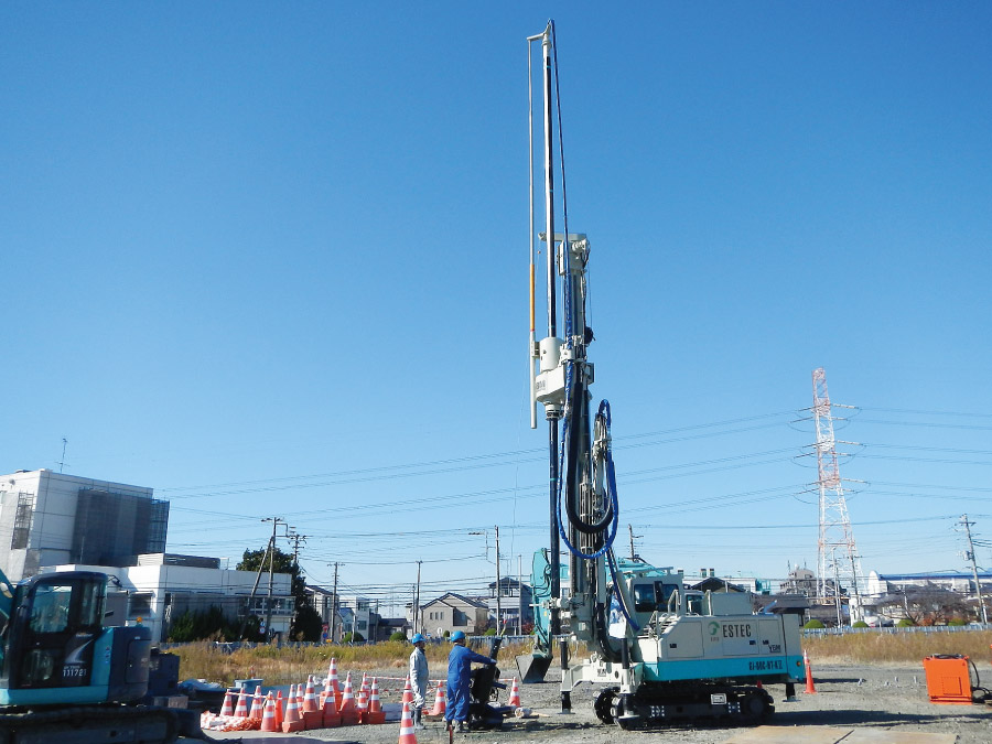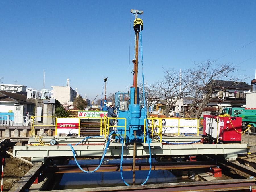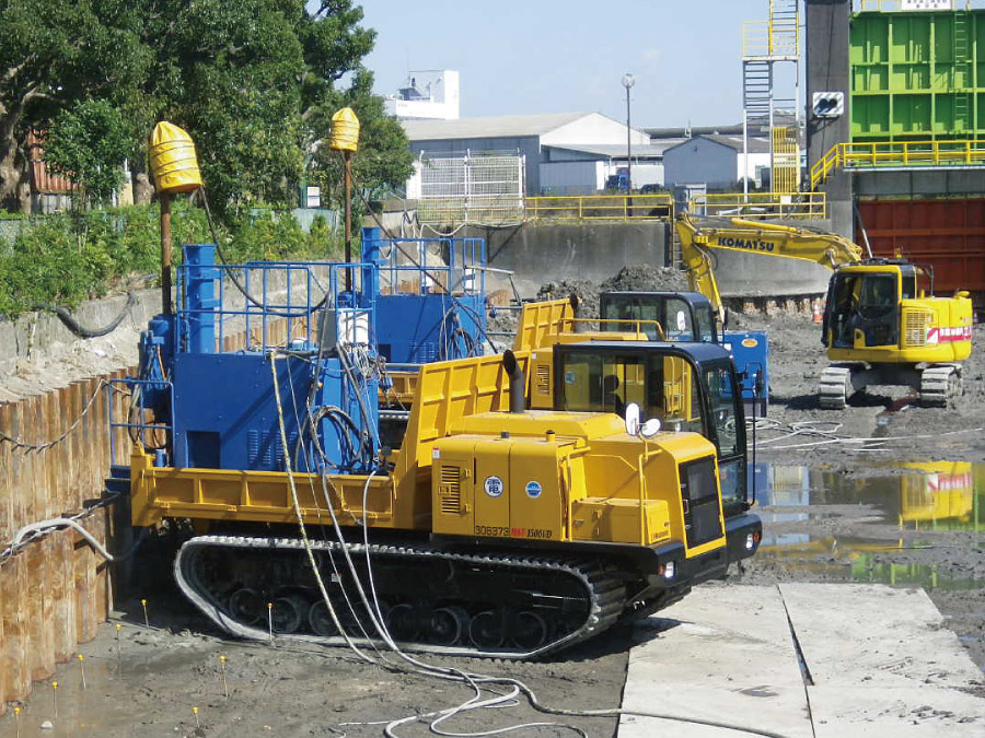 - ■ 機械攪拌工法に比べてボーリングマシンと横行式移動架台をベースとした軽量、コンパクトな施工機械で大口径の改良体を造成できます。