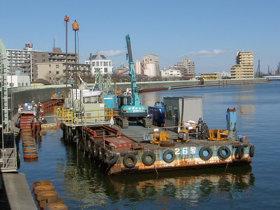 - ■ H鋼や台船に横行式移動架台を組み合わせた簡便で効率的な仮設での施工のため、仮設費用の低減が計れます。