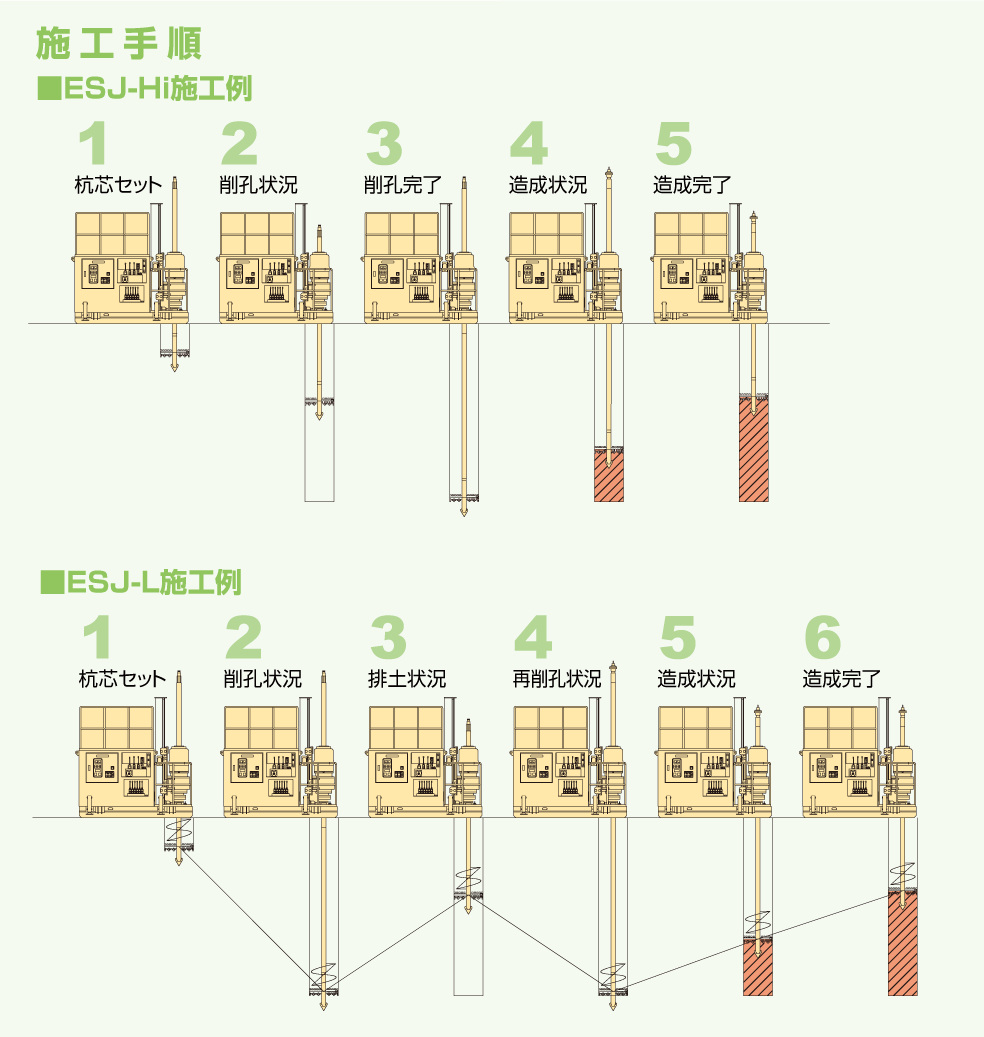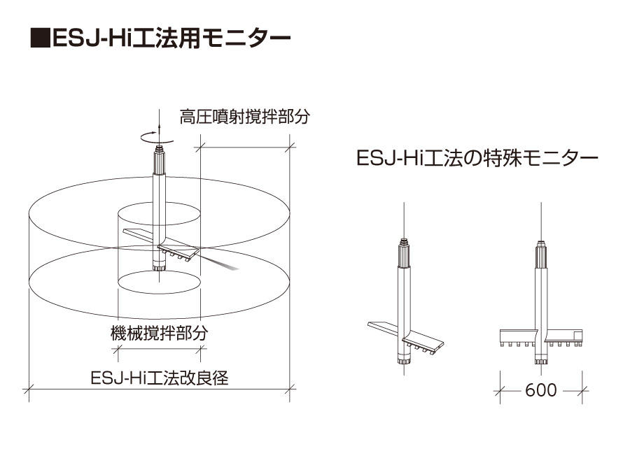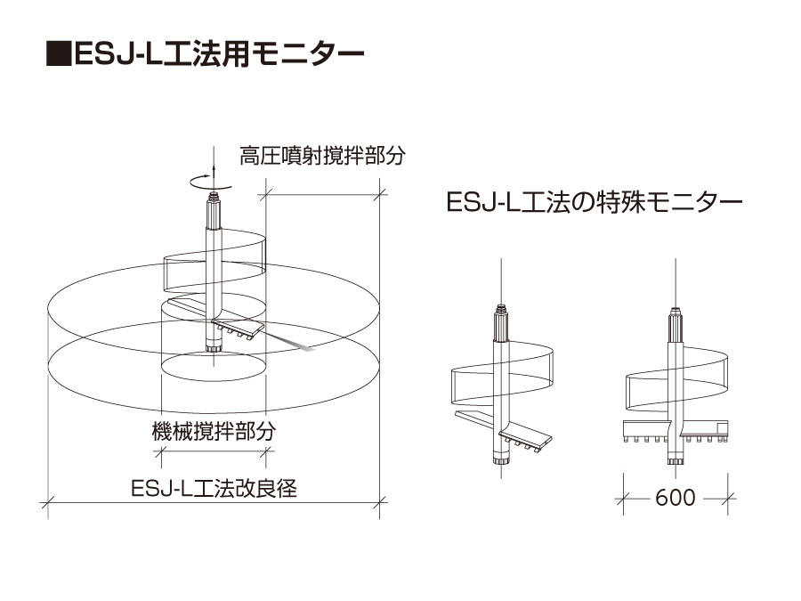 ESJ-Hi、ESJ-L工法は、ボーリングマシンを使って、ロッド先端に装着した攪拌翼付特殊モニターから水平方向に固化材スラリーを超高圧(40MPa)、吐出流量(100L/分)で噴射しながら回転引き上げを行い、中心の攪拌翼部の機械攪拌と外周部の高圧噴射攪拌を組み合わせることにより、地盤中に円柱状の改良体(コラム)を造成する工法です。