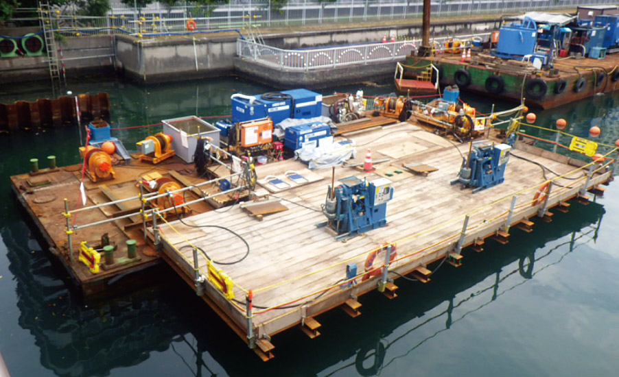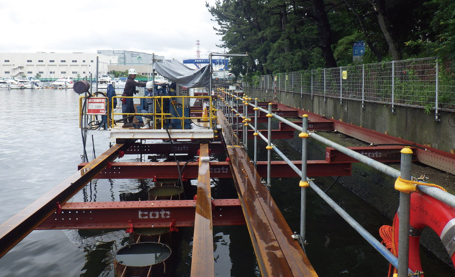 - ■ H鋼や台船に横行式移動架台を組み合わせた簡便で効率的な仮設での施工のため、仮設費用の低減が計れます。