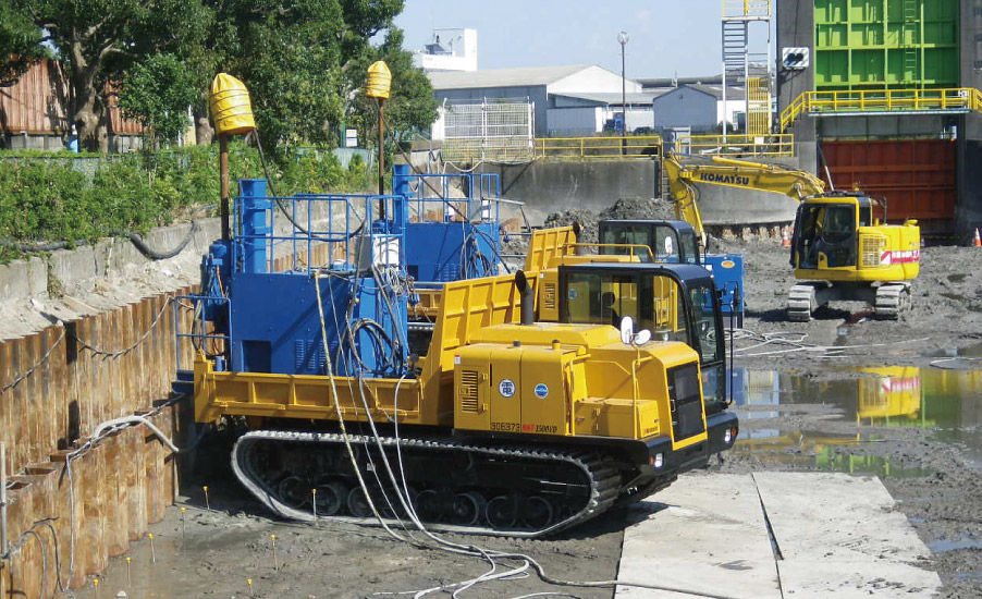 - ■ 機械攪拌工法に比べてボーリングマシンと横行式移動架台をベースとした軽量、コンパクトな施工機械で改良体を造成できます。