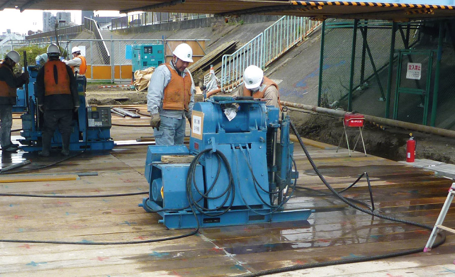 - ■ エアーを使用せず、セメントミルク(スラリー)のみの噴射のため、河川内や港湾内での水中施工においてエアブロー等による水質汚濁がありません。